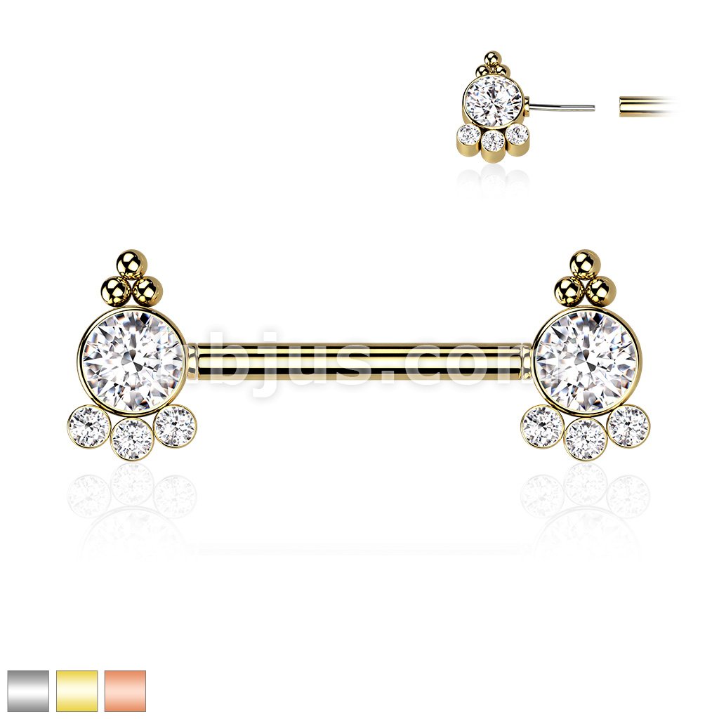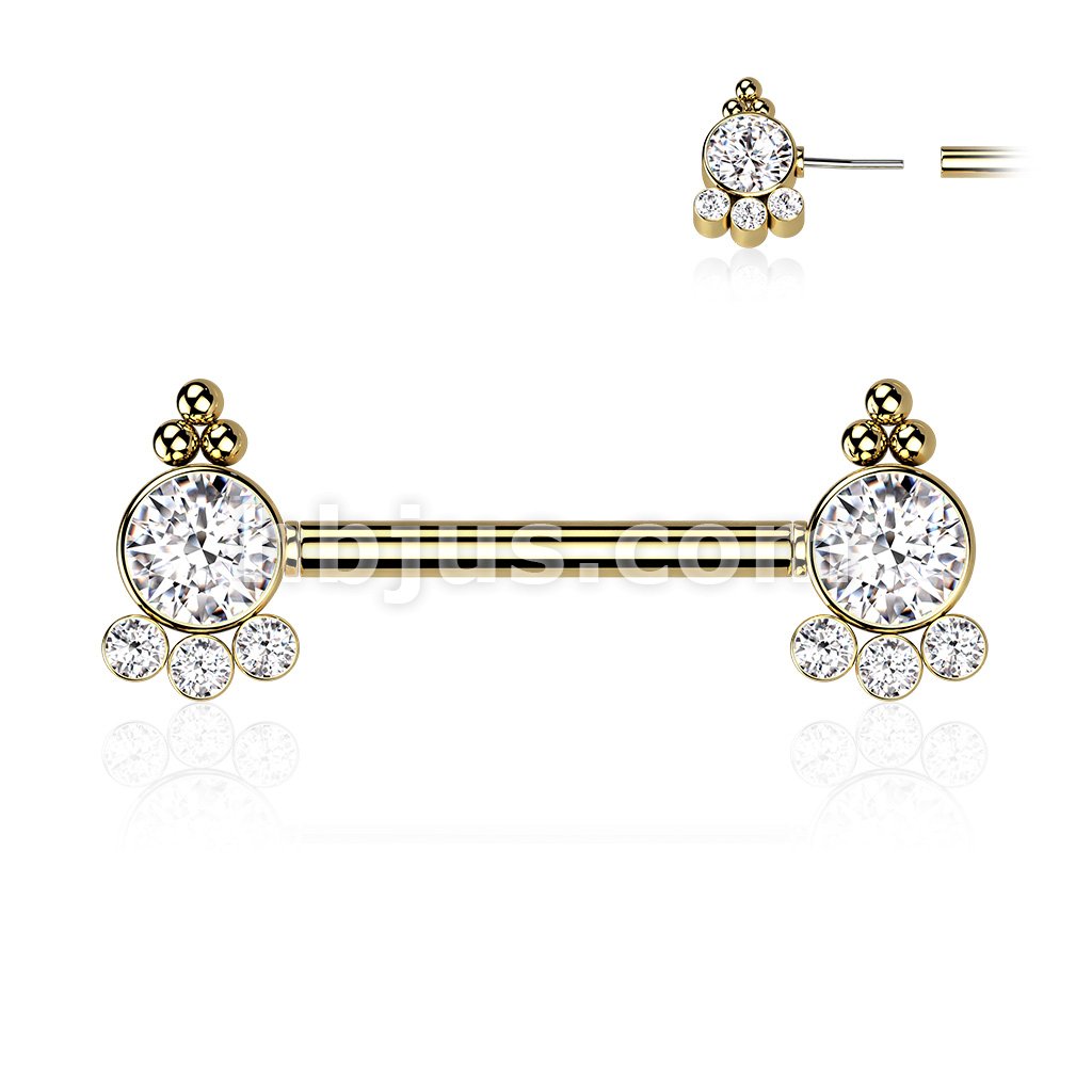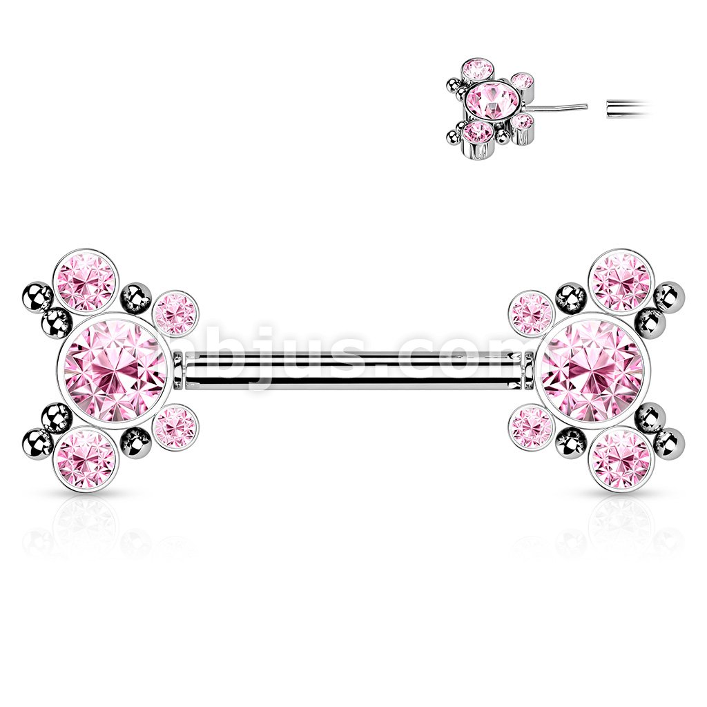 316L Surgical Steel Threadless Push In Nipple Barbell with 4 CZ and Ball Cluster On Each Side