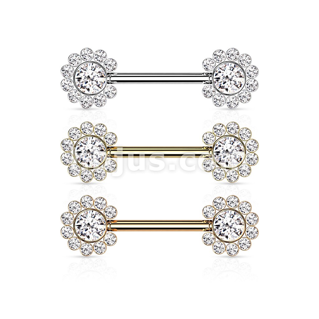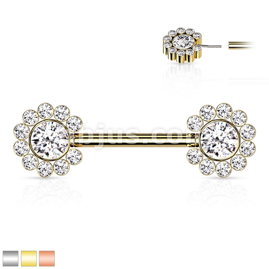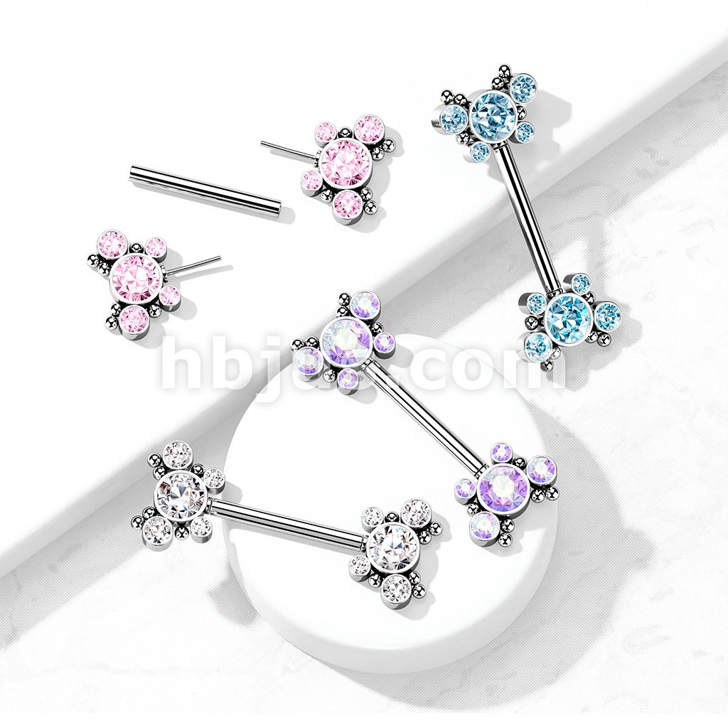 316L Surgical Steel Threadless Push In Nipple Barbell with 11 CZ Flower Cluster On Each Side